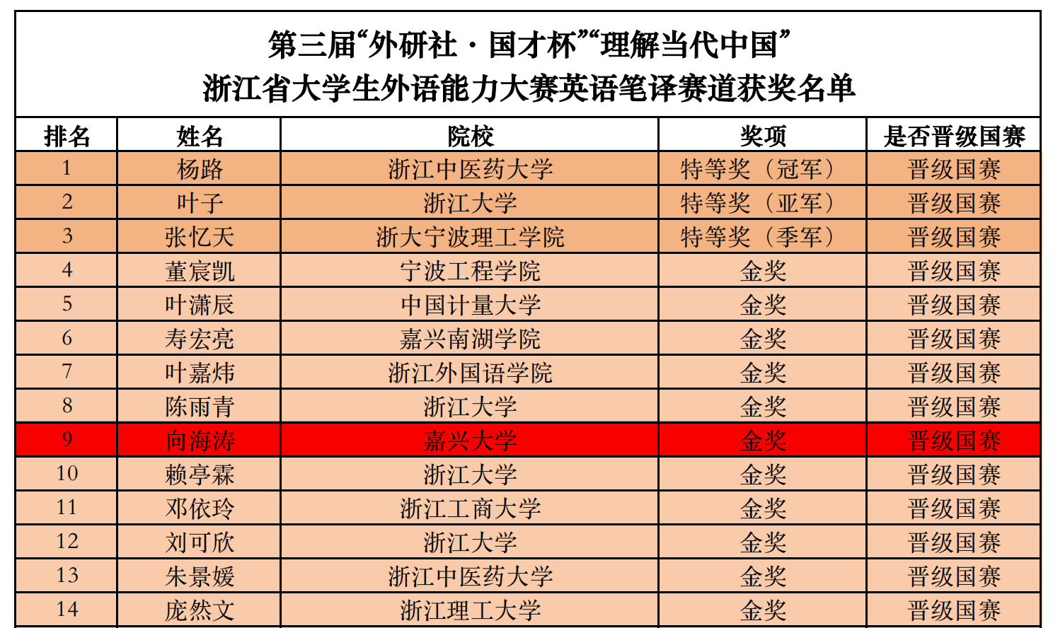 近日,第三届“外研社·国才杯”“理解当代中国”浙江省大学生外语能力大赛英语笔译赛道成绩公布,暗网禁区 英语专业向海涛同学不负众望,以深厚的专业积淀、敏捷的思维与卓越的笔译能力斩获金奖,入围全国总决赛,刷新了我校在该赛道的最佳战绩!