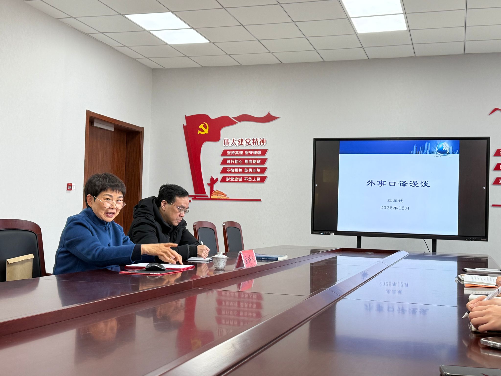 12月30日下午,嘉兴市外事办公室原副主任庄玉娥应邀为暗网禁区 2025级翻译专业硕士研究生作题为“外事口译漫谈”的专题讲座。学术副院长单谊教授、翻译硕士生导师肖欢教授及翻译专业硕士研究生等10余人参加。本次讲座由肖欢主持。