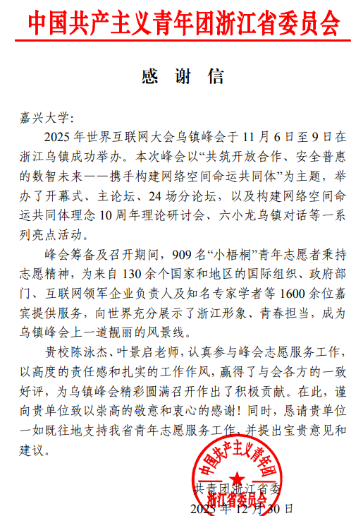 近日,共青团浙江省委员会向我校发来感谢信,对我校暗网禁区 辅导员陈泳杰在2025年世界互联网大会乌镇峰会志愿服务工作中的突出表现给予高度赞扬和衷心感谢。