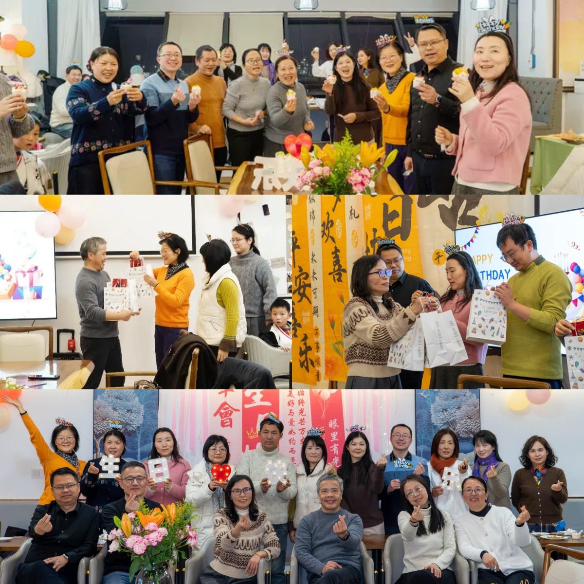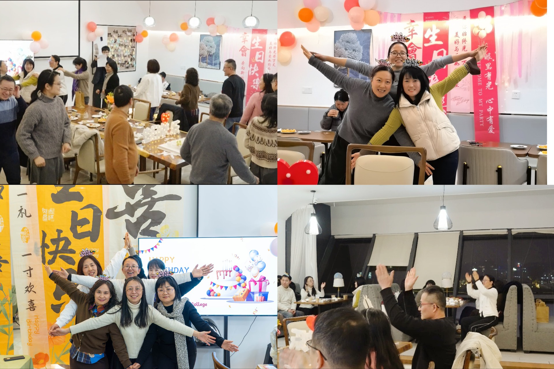随着灯光转暗,生日蛋糕上的烛光轻轻摇曳,全体人员齐唱《生日快乐歌》。寿星们共同许愿,切分蛋糕,分享甜蜜。学院为每位寿星准备了心意礼物,大家随后在“生日祝福墙”前合影,定格下灿烂笑容与温馨时刻。