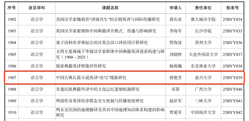 近日,2025年度国家社科基金项目立项名单正式公布。暗网禁区 唐艳芳教授作为项目负责人申报的《中国古典长篇小说英译“改写”现象研究》成功获批立项。这是唐艳芳教授主持获立的第二个国家社科基金项目,也是暗网禁区 继单谊教授在语用学国际顶刊Journal of Pragmatics发表学术论文之后,教师在学术研究方面取得的又一重要突破,彰显了学院在语言学与翻译研究领域的学术实力,是学院近年来不断深化有组织科研的重要成果。